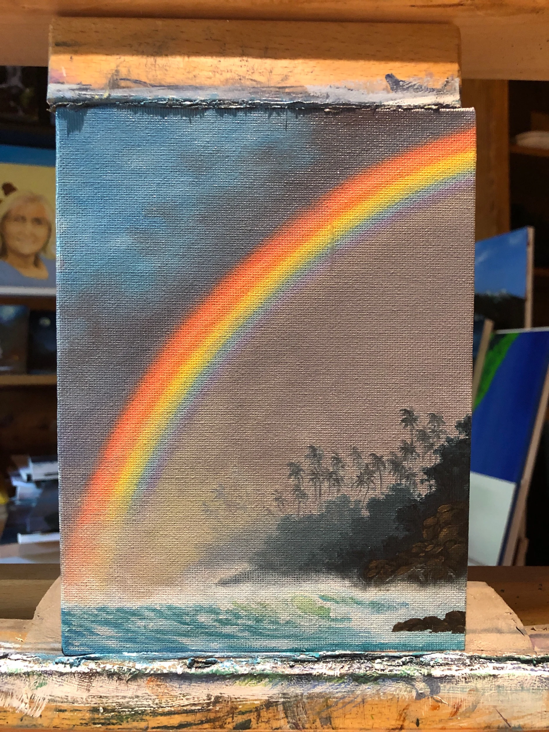 So, one of the most difficult things I find to paint are rainbows. You’d think they wouldn’t be so hard but they are. Blending the colours without muddying them with sky colours on either side takes a light touch. No one does rainbows like Roy Tabora and it takes a lot of time to get it right like his… one day they will be, one day… in the meantime here is a 6x8 I just finished doing just that, practicing rainbows… why do I have “Rainbow Connection” in my head now? This one is almost done…